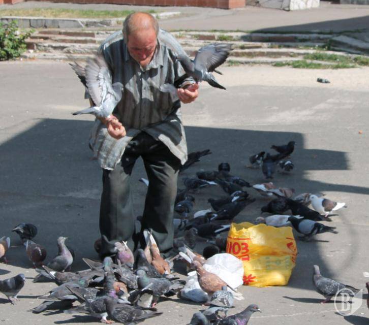 Чоловік особливо не переймається тим, що про нього думають оточуючі. Головне він набрав шматки викинутого кимось хліба і годує птахів.