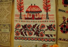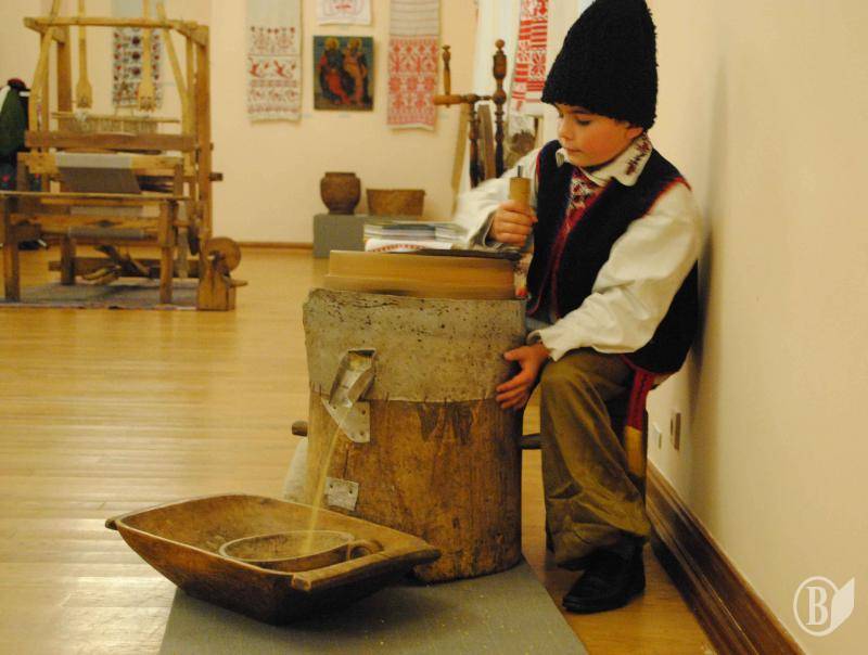 Ікона два-в-одному, рушники, національний одяг, ткацький верстат, хлопчик, що працює на жорнах і прямо на очах у прискіпливої столичної публіки перемелює кукурудзу в борошно.