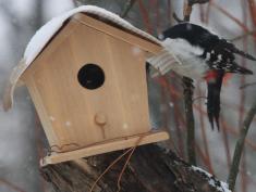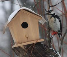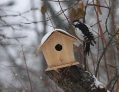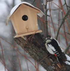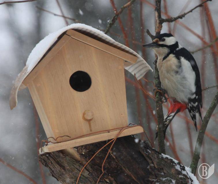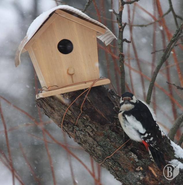 До речі, хатинка-«синичник», яку ви бачите в кадрі, для дятла за маленька. Але Великі строкаті дятли можуть поселитися розвішених для птахів шпаківнях в садах і парках.