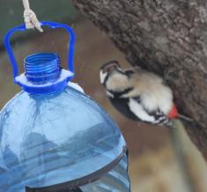 Дятел не спокуситься на насіння доки є надія на інший корм. Воно його не цікавить.Наприклад, великий строкатий у цьому фоторепортажі оглянув новенький синичник.