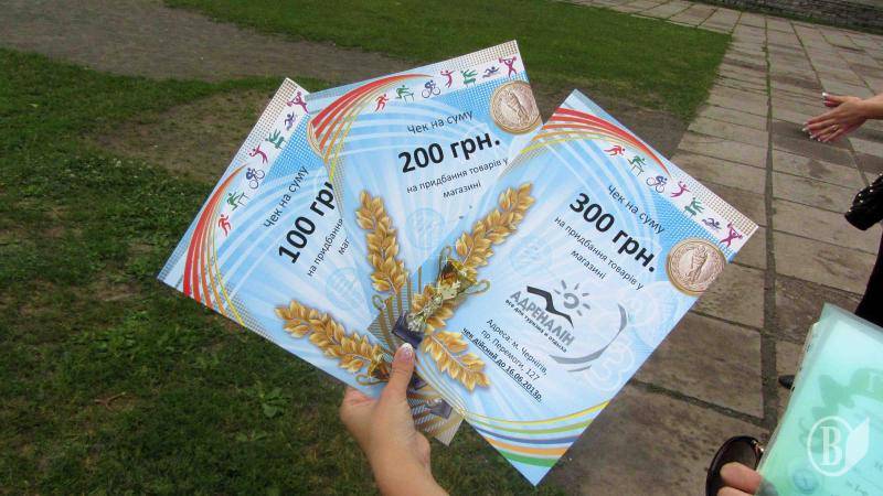 Сім’ї з дітьми до дев’яти років нагороджувалися сертифікатами на придбання спортивного обладнання на 100, 200 та 300 грн. за зайняті ІІІ-є, ІІ-е, та І-е місце відповідно.