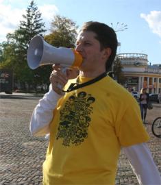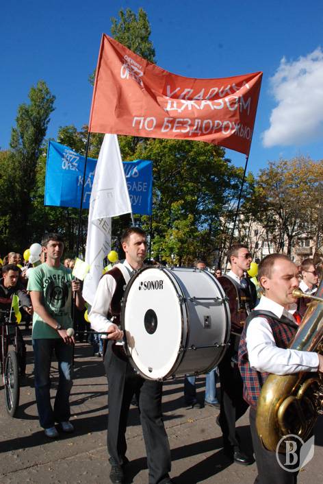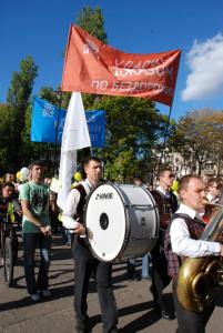 В шляпах и париках, с флажками и воздушными шариками, со свирелями и трещотками, взрослые и маленькие, джазмены и просто прохожие. Колонна во главе с оркестром пройдет по проспекту Мира, сделает круг по Красной площади, а дальше джаз-парад медленно превратится в джазовый марафон на Зеленой сцене. Джазовые коллективы из Чернигова («Диксиленд», F-trio) и Киева (квинтет Алены Саловой) своей музыкой разгонят осенний мрак и помогут настроиться на веселую ноту.