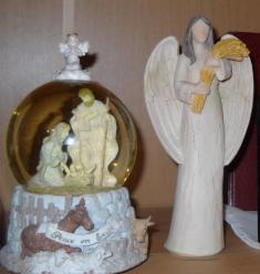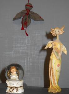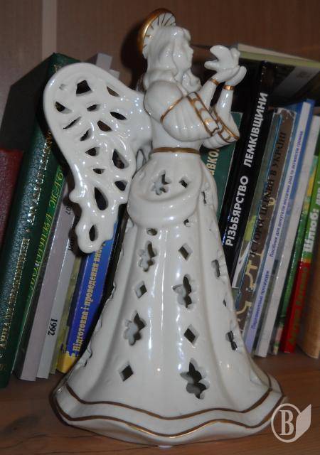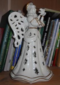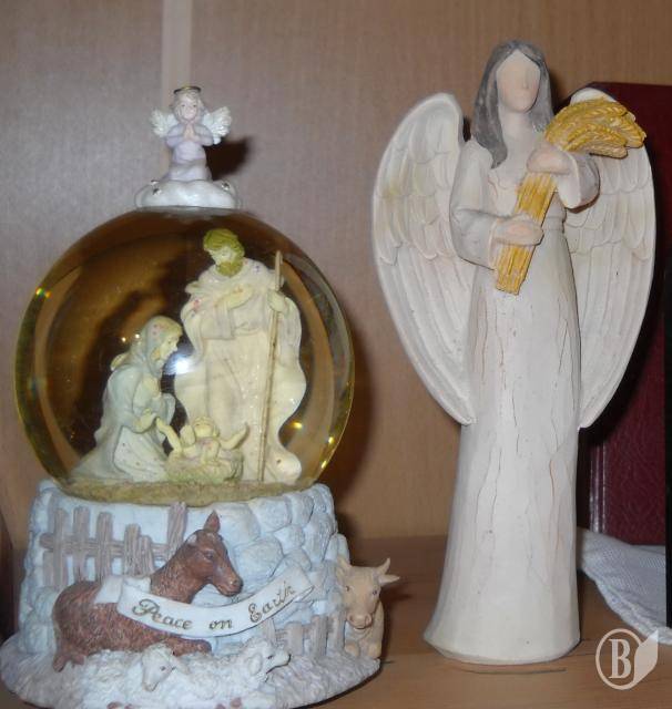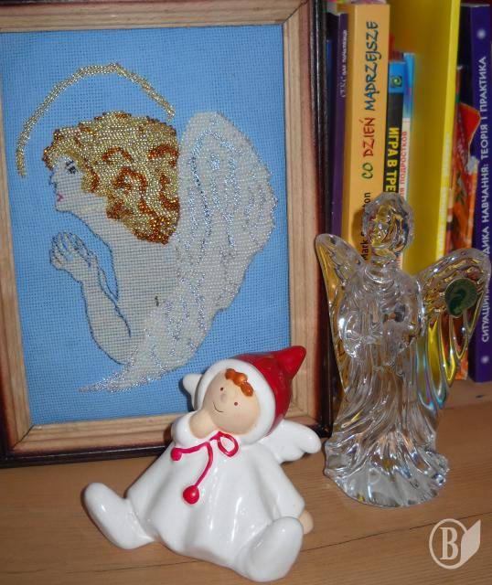 - Якщо порахувати тих, які живуть у мене вдома і тих, котрі оселилися в двох офісах нашого Центру, то вийде близько 40. Янголи в мене з різних країн: США, Канади, Німеччини, Польщі, України. Той біленький фарфоровий ангел, що тримає в руках колоски, приїхав з Великої Британії, мені його подарували з нагоди річниці Голодомору. Він має захистити родину від голоду. Ще один заморський гість – різдвяний янгол, його надіслала подруга з Америки, привітала з Різдвом. Є в колекції ще декілька різдвяних ангелів: один в скляній кулі, і якщо її перевернути й потрусити, янголятко начебто обсипає сніг. Ще одна скульптура зображує сцену народження Христа, зверху за цим таїнством також спостерігає маленьке янголятко. Малесенький кришталевий янгол з сердечком приїхав з Німеччини, я купила його як сувенір. До нього є коробочка з написом, але ніяк не доберуся, аби його перекласти.Можливо, він також має певну функцію. Тут є і янгол з Польщі – дерев’яний.