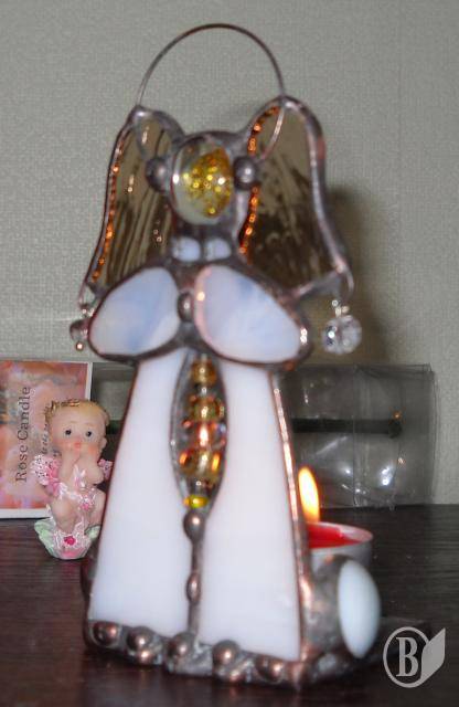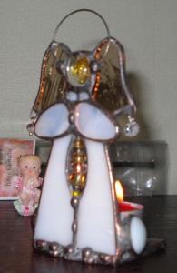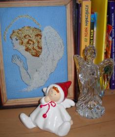 На полицях ви бачите і декілька лялечок-тільд, одну з них зробила мама нашої дитини і подарувала мені, а другий схожий ангел висить у нас в приміщенні центру. Ще одну тільду мені подарували друзі тут, в Україні. Вишита робота з зображенням ангела – подарунок нашому Центру від студентки педагогічного університету, нашої волонтерки. Ангел-підсвічник приїхав зі Львова, це також подарунок на день народження. Це вітраж, напевно, авторська робота. Він дуже гарний! Нещодавно друзі подарували також репродукцію роботи художниці Євгенії Гапчинської, а вона, до речі, постійно малює ангелів.