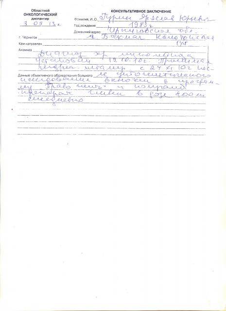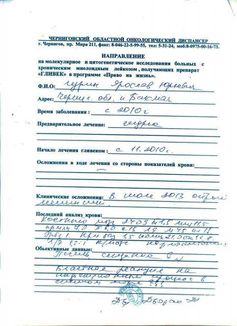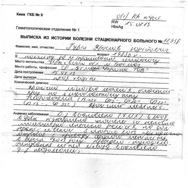 Ровно восемь дней, они с Таней были один на один со своей бедой. За одни сутки врачи скорой помощи приезжали по три четыре раза. В итоге врачи гкб посоветовали проверить хмл. Ярослав был направлен в г. Чернигов, на обследование.