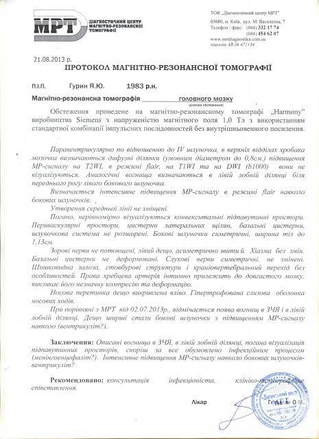 Диагноз был поставлен в день обращения. Острый менингоэнцефалит. Месяц Ярик находился на лечение в неврологии. Наступило облегчение. По приезду в Киев он немедленно вышел на работу, ровно на один месяц, и снова боли.