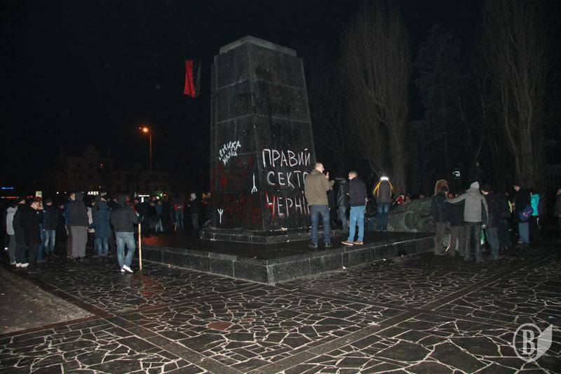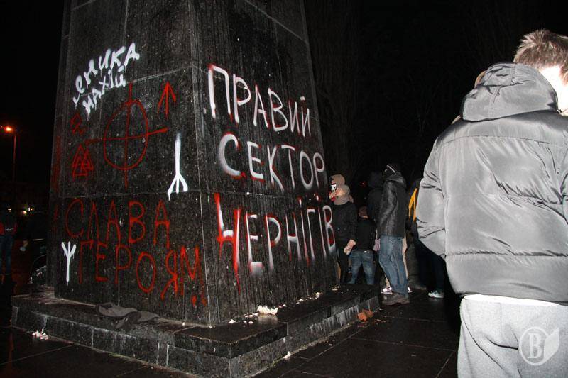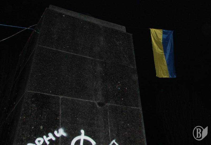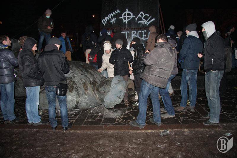 Как сообщал "Высокий Вал", решительно настроенная молодежь подошла вечером к памятнику, который охраняли комсомольцы и коммунисты. После словесного противостояния в ход пошли яйца. Впоследствии местная "Свобода" доставила на место события тросы и лестницы, сторонники коммунистической идеи прекратили оказывать сопротивление.