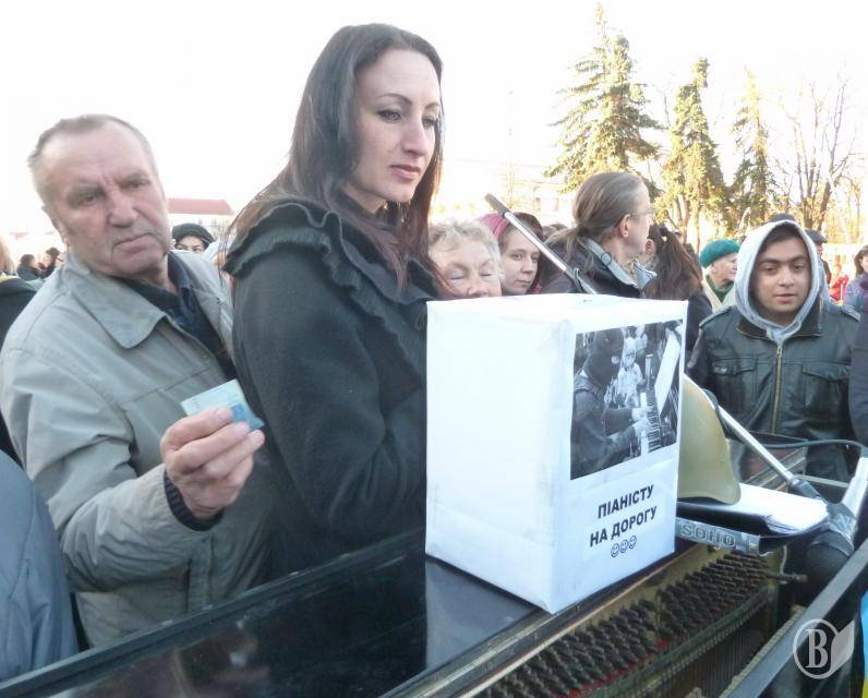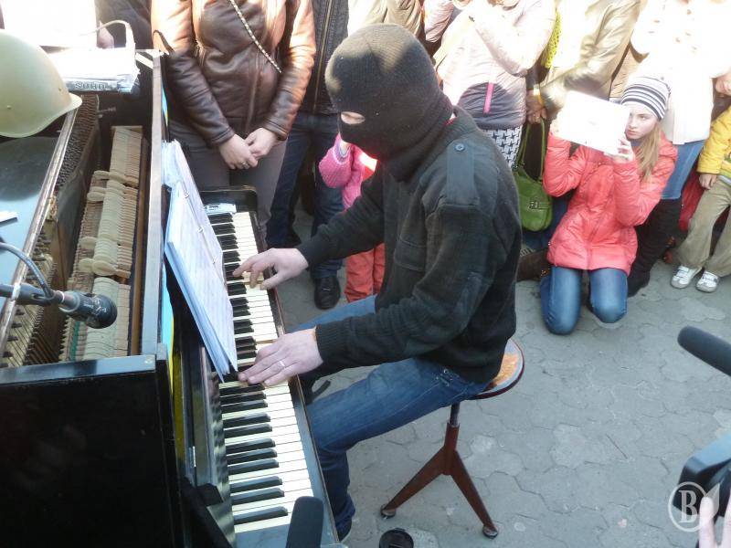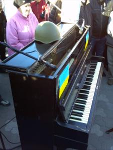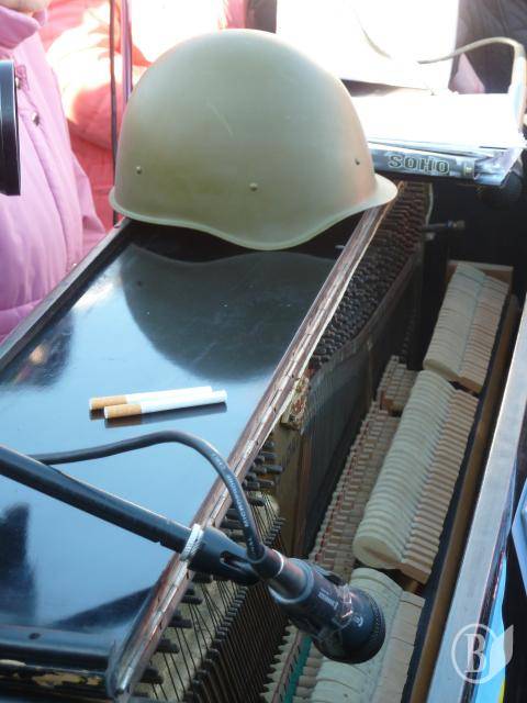 На пианино – военная каска, в которых на Майдане были и активисты, и журналисты.