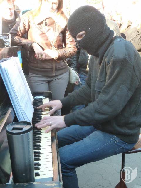 Он долго настраивает пианино. И начинает играть классические произведения. Мужчина - в маске-балаклаве.