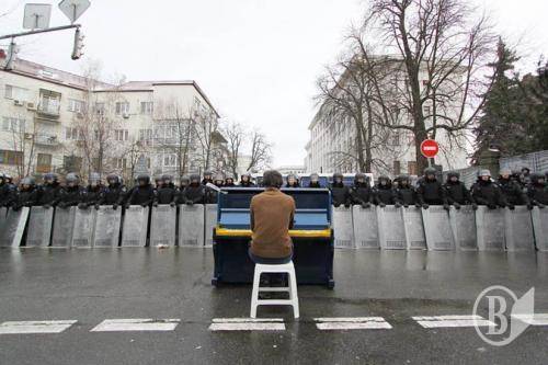 Як відомо, жовто-блакитне піаніно стало одним з символів Євромайдану. Акцію з грою на піаніно провели 7 грудня троє львів’ян.