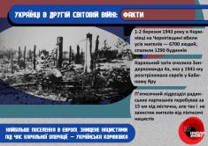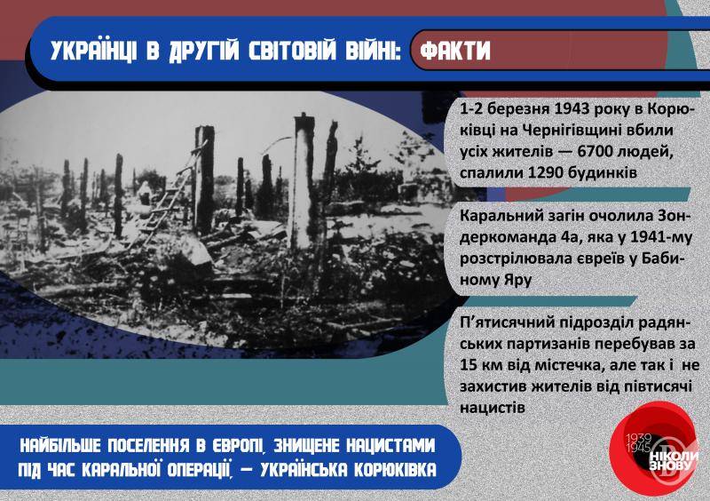 Например, немногие знают, что село Корюковка на Черниговщине – самое большое в Европе поселение, уничтоженное нацистами: во время карательной операции. 1-2 марта 1943 года в Корюковке нацисты убили 6700 людей и сожгли 1290 домов.