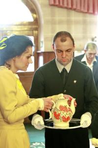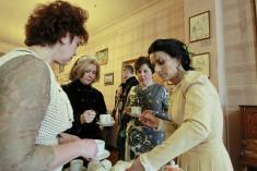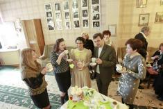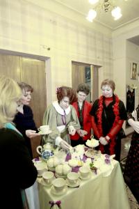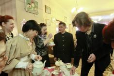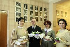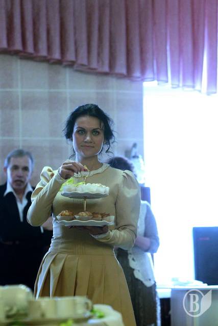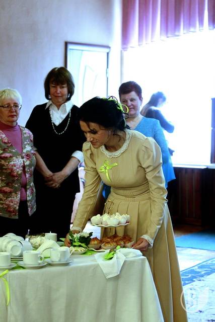 И вот наступило время «ЧЕ». В изысканный зал словно выплывают хозяйки столов и началась необычная чайная церемония под громкие аплодисменты гостей. Праздник начался. Здесь, нужно сказать, поднялся такой шум, продолжались разговоры, кто-то просил молока к чаю, кто-то просто наслаждался необычным проектом праздника. А вечером для почитателей – спектакль. Вот так они и живут, работают и отдыхают. Что же друзья, еще раз с праздником ВАС, с ДНЕМ ТЕАТРА!