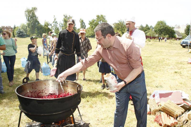Что любопытно, готовить вкусности для горожан помогал лично Геннадий Корбан, помешивая на огне зажарку здоровенной дубовой кописткой – лопатой.