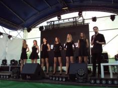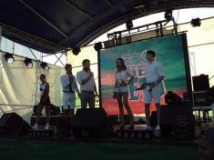 В 19:00 под музыку известной всем песни "Про зайцев", которую многие знают по монументальному фильму "Бриллиантовая рука", на сцену вышел фронтмен Театра КВН ДГУ, известный и титулованный актер и КВНщик - Евгений Чепурняк. А вслед за ним на сцене появился весь состав театра КВН, который во главе со своим лидером исполнил дебютную музыкальную композицию, приветствующую всех зрителей, собравшихся возле сцены.