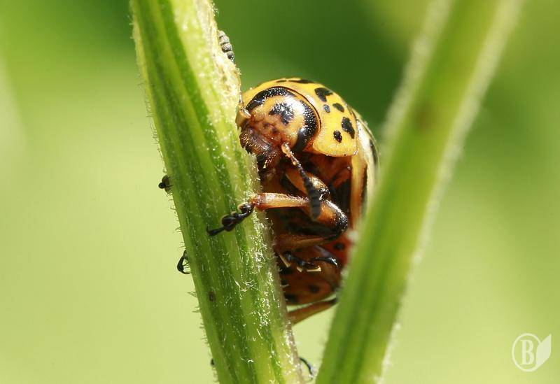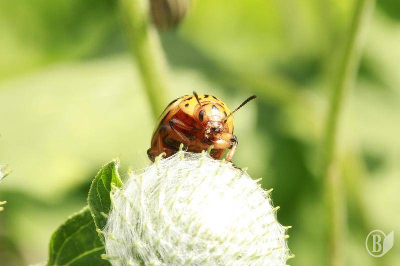 І тут мою увагу привернули пахучі квітки лопуха зі хмелями. Аж гульк, рядом сидить колорад. І що ви думаєте він робить, він їсть стебло лопуха.
