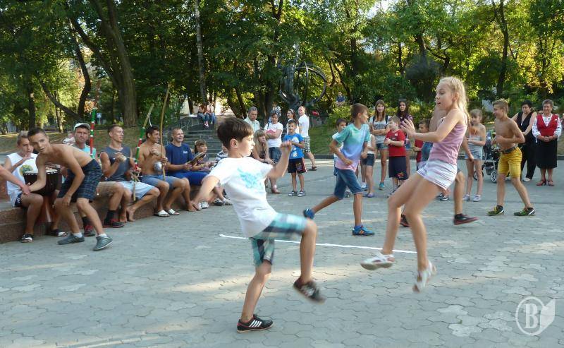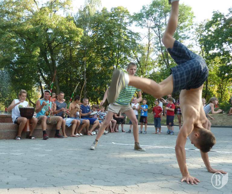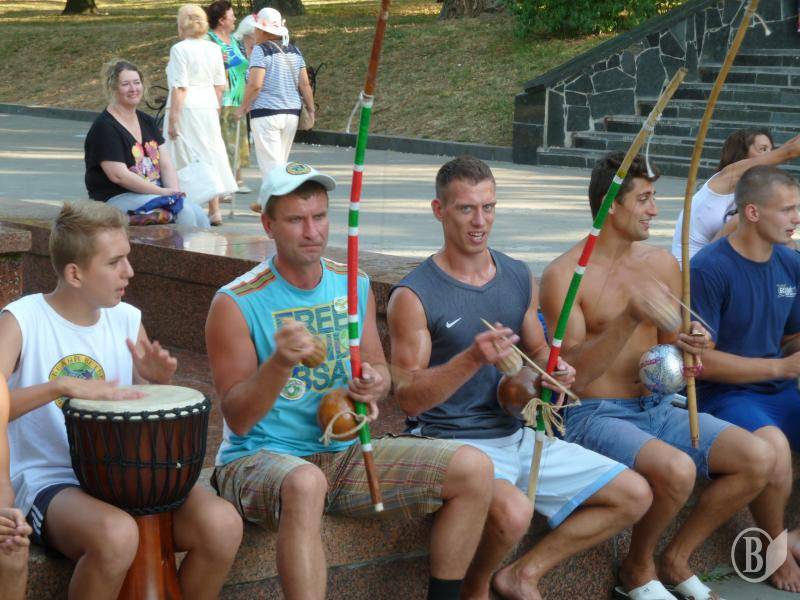 Афробразильське бойове мистецтво з елементами танцю, музики і акробатики демонстрували сьогодні, на День Прапора вільні митці на чернігівській Алеї героїв.