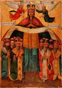 Особенное уважение к Покрове Богородице збереглось, когда казачество создало свое государство – Гетьманщину. В нем в XVII–XVIII вв. расцветает «казацкое барокко». Возникает и новый тип иконы – «Казацкая Покрова». На ней под покровом-омофором Богородицы иконописцы размещают украинских иерархов, гетманов, старшину и значительных казаков.