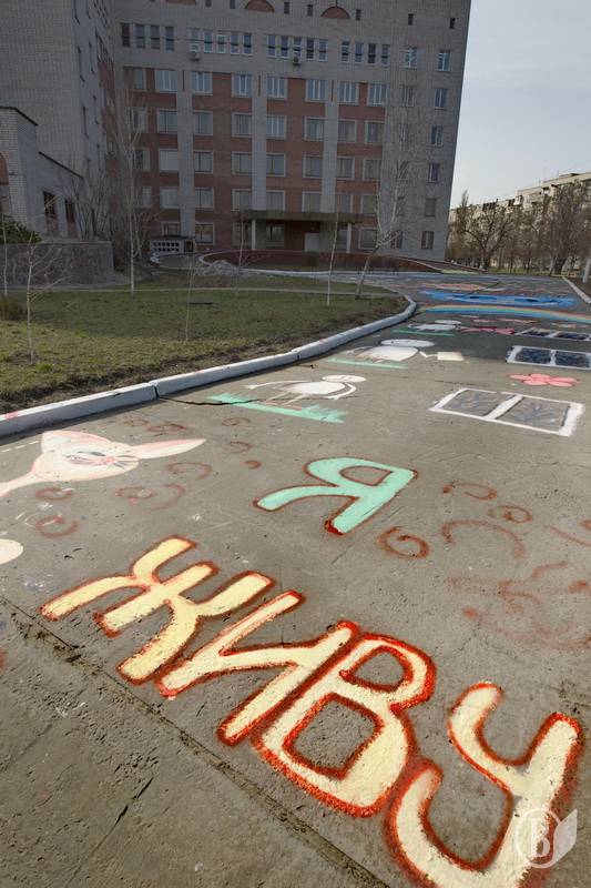 В конечном итоге все желающие собрались перед главным корпусом областного онкодиспансера, развели краски, разобрали щетки, рисунки и пока не село солнышко рисовали и рисовали, все кто хотел.