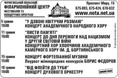 Чернігівський обласний центр фестивалів та концертних програм запрошує відвідати 5, 11, 15 травня наведені нижче заходи.
