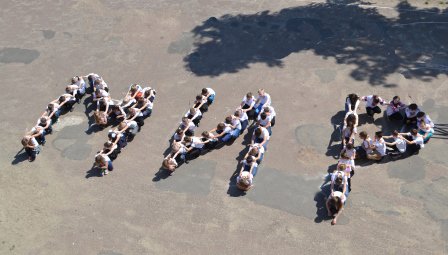Прямо во дворе учебного заведения участники акции, одетые в белые футболки, выстроились друг за другом и сложили слово «Мир», голубя и цветок мака, который уже давно во всем мире является символом скорби по погибшим воинам.