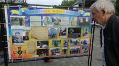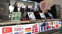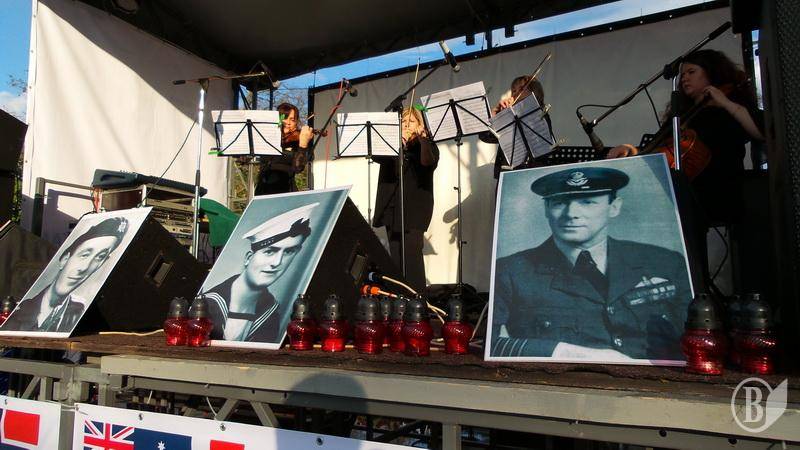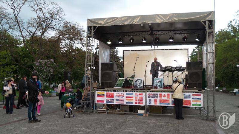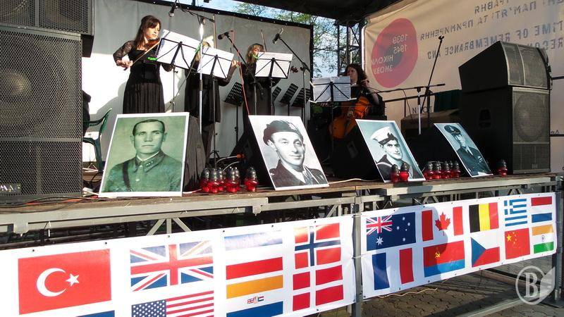Чернигов отмечает дни памяти и примирения. На Аллее героев расположенная сцена с флагами стран-участниц Второй мировой и портретами их солдат.