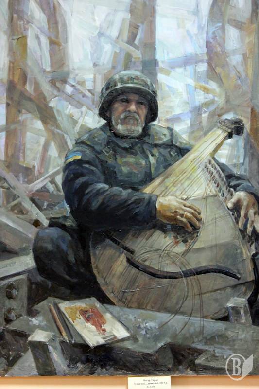 Художні образи більш виражено відчуваються поруч з артефактами – пробита осколком каска, військова амуніція та фрагменти озброєння, бандура та гільзи, прикрашені дитячими малюнками.