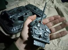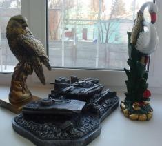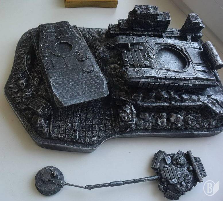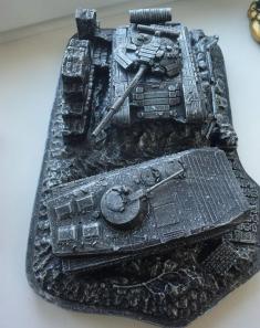 3. Композиція «Техніка ЗСУ в бою» (зображує український танк «Булат» і БМП). Башти техніки знімаються. Вага – 5 кг. Розміри 42*28 см. Стартова ціна – 500 грн.
