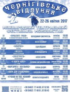 Сподіваємось, що запропонована програма фестивалю моновистав «Чернігівське відлуння – 2017» зацікавить наших глядачів, а започаткований фестивальний захід стане доброю традицією й окрасою театральної весни нашого древнього Чернігова.