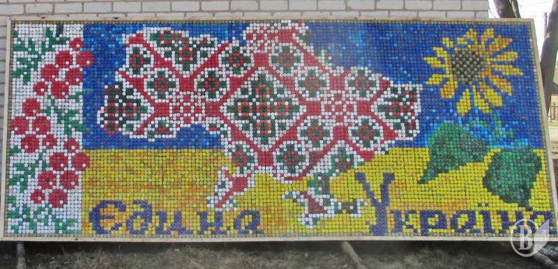«Кришечки збирали всією громадою. Їх навіть пересилали нам волонтери з Яготина. Ці кришечки чистили, мили, стирали логотипи. Всі разом створили картину розміром 2 на 5 метрів, яка стала окрасою музичної школи. Зображена на ній карта України з вишиванкою», - розповів директор Холминської ЗОШ Шевчик Олександр Іванович.