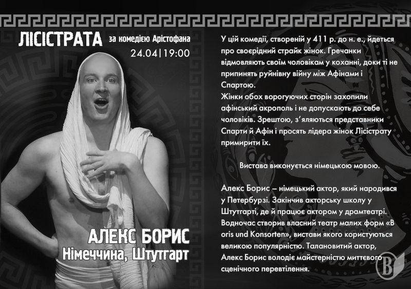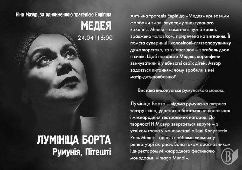 У програмі третього дня фестивалю актриса з румунського міста Пітешті Лумініца Борта представить моновиставу Ніни Мазур «Медея» за однойменним твором Евріпіда, в основу якої покладено трагедію пристрасного кохання і кривавої помсти зрадженої жінки. Ввечері цього дня на великій сцені актор з Німеччини Алекс Борис жартома відтворить історію боротьби давньогрецьких жінок проти війни між Афінами і Спартою, відображену в комедії Арістофана «Лісістрата».