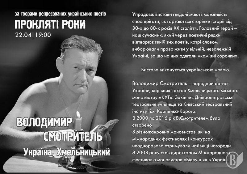 Почесне право відкрити «Чернігівське відлуння–2017» надано Хмельницькому монотеатру «Кут», який упродовж майже двох десятиліть культивує мистецтво моновистави на теренах України. Керівник цього театру, народний артист України Володимир Смотритель презентує глядачам свою творчу роботу «Прокляті роки» за творами репресованих українських поетів.