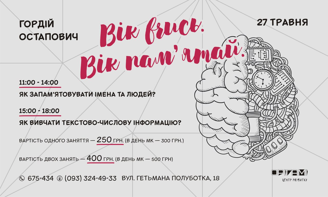 Живучи в час божевільного інформаційного потоку, переважна більшість людей розуміє, що якісна робота пам'яті відіграє вирішальну роль в досягненні особистісного та кар'єрного успіху. Теми, які підніме Гордій — актуальні для кожної сучасної людини на 100%.