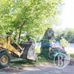 На вході до міського пляжу «Золотой берег» з боку пішохідної доріжки від Центрального парку культури й відпочинку триває демонтаж скульптур Нептуна і русалки.