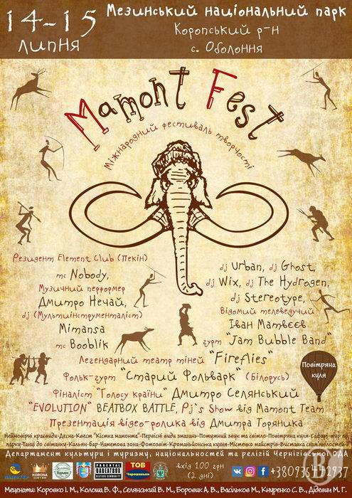 Зокрема, 14-15 липня на території Мезинського національного парку відбудеться Міжнародний щорічний фестиваль історії та творчості «Mamont fest».