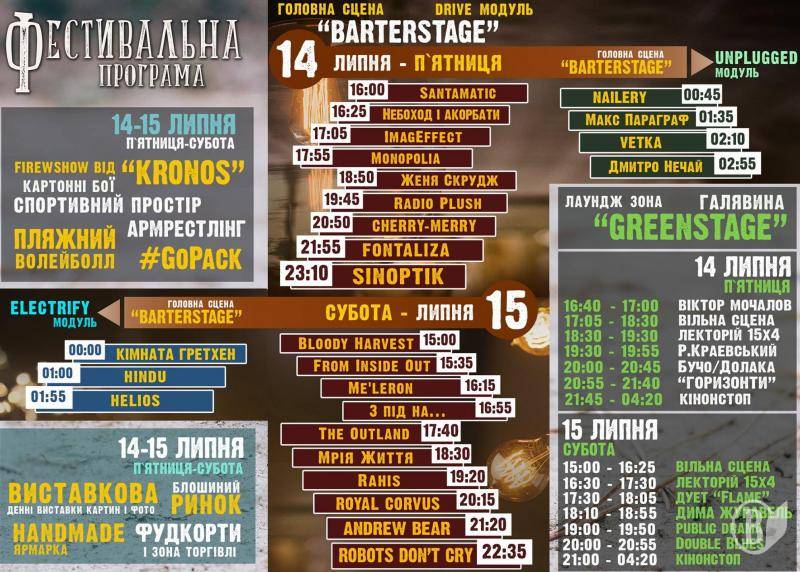 На вас чекає музика на будь-який смак: виступи Sinoptik, Robots Don't Cry, Fontaliza та ще 30 артистів, виставки живопису і фотографій, handmade ярмарка, блошиний ринок.