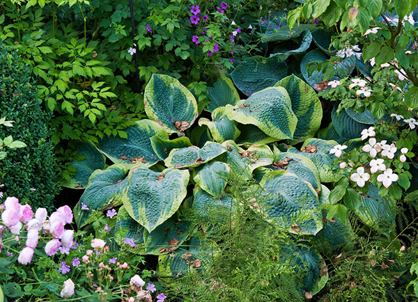Волна увлечения декоративными растениями не обошла местных цветоводов. Ярким свидетельством этого является выращивание хосты сорта «Frances Williams». Это растение привлекает внимание не своими цветами, а необычным листьями синего цвета со светло-зеленой каймой. А вот цветы хоста имеет почти незаметные. Это маленькие белые цветочки которые появляются на невысокой стрелке. Цветут эти цветочки несколько недель и опадают так же быстро как и появляются. Но это никак не сказывается на привлекательности листьев хосты, они и далее будут продолжать собирать удивления и восхищения.