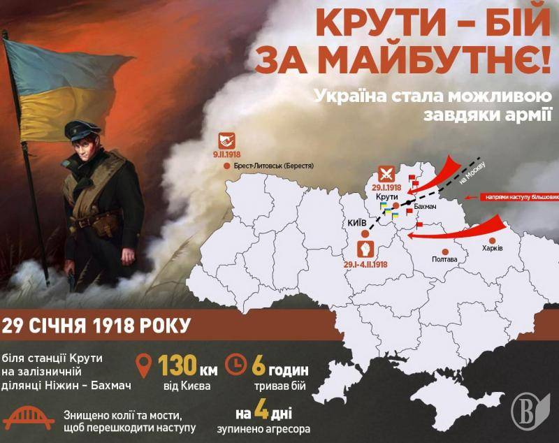У квітні 1918 року завдяки підтримці німецьких та австро-угорських військ (відповідно до Брестського договору) українці звільнили від більшовиків майже всю Україну. Отже, бій під Крутами став боєм за майбутнє України.