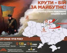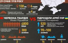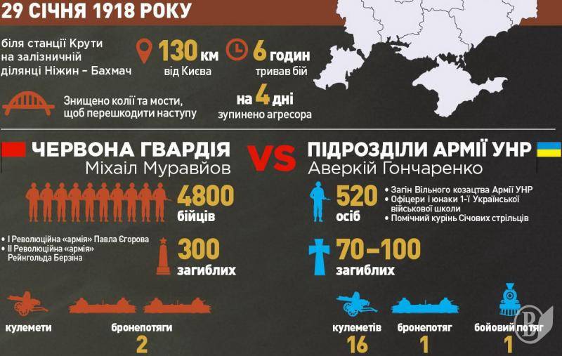 29 січня 1918 року на залiзничнiй платформi в Крутах перебувало до 520 українських воякiв, юнакiв і студентiв, озброєних 16 кулеметами та однією гарматою. Росіяни вдесятеро переважали, мали бронепотяг та артилерію.
