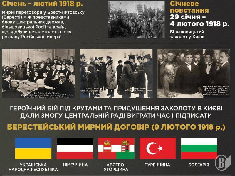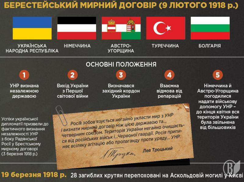 9 лютого 1918 року Брестський мирний договір було підписано. Він означав визнання самостійної Української Народної Республіки суб’єктом міжнародних відносин.