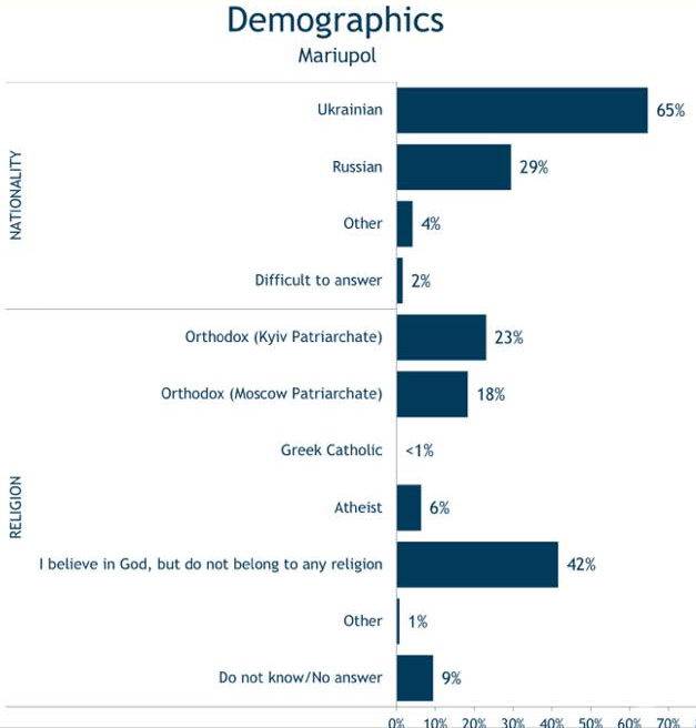 Навіть на сході у прифронтовому Маріуполі на 5% більше опитаних ідентифікують себе з УПЦ КП, ніж з МП: 23% і 18%.