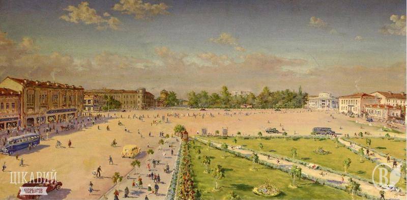 В СРСР непросто було зафіксувати вигляд міста в кольорах в часи, коли кінотеатр ім. Щорса вже був збудований (після 1939 року), але ще не було музично-драматичного театру ім. Шевченка (1959 рік).