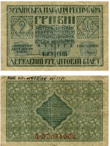 - 1 – Банкнота номіналом 2 гривні. Автор проекту В. Кричевський.