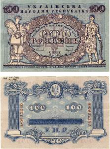 1 січня 1918-го Центральна Рада ухвалила «Тимчасовий закон про випуск державних кредитових білетів УНР». Першими українськими грошима стали банкноти «100 карбованців», оформлені відомим художником-графіком Григорієм Нарбутом.