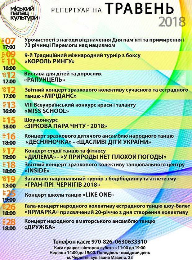 Чернігівське комунальне підприємство «Міський палац культури» повідомляє про свій рпепертуар на травень місяць 2018 року.