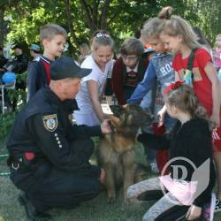 Поряд на галявині діти спостерігали за роботою поліцейської собаки Вільми та її вміннями розшукувати будь-які предмети. Батьки із задоволенням робили фото із чотирилапим помічником поліції, а малюки гладили таку величезну, але таку спокійну вівчарку.