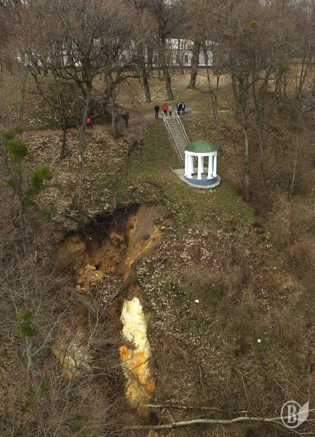Тріщини, найближча з яких знаходиться всього за 2 метри від альтанки, добре проглядалися весною, коли ще не було трави, з квадрокоптера. Ним і були зроблені знімки, відразу опубліковані керівництвом історичного музею та його філії-садиби у соцмережах і надіслані відповідальним чиновникам.