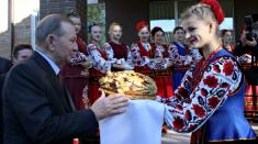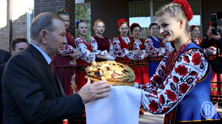 Запашним короваєм, теплими словами, дзвінкими українськими піснями та пронизливою грою на новому фортепіано зустріли Леоніда Кучму на порозі Ніжинського коледжу культури і мистецтв. Разом з ним прибули й інші гості.