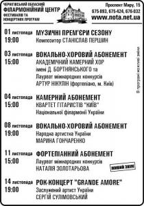 Чернігівський обласний філармонійний центр фестивалів і концертних програм повідомляє про свої заходи, заплановані на першу половину листопада 2018-го.