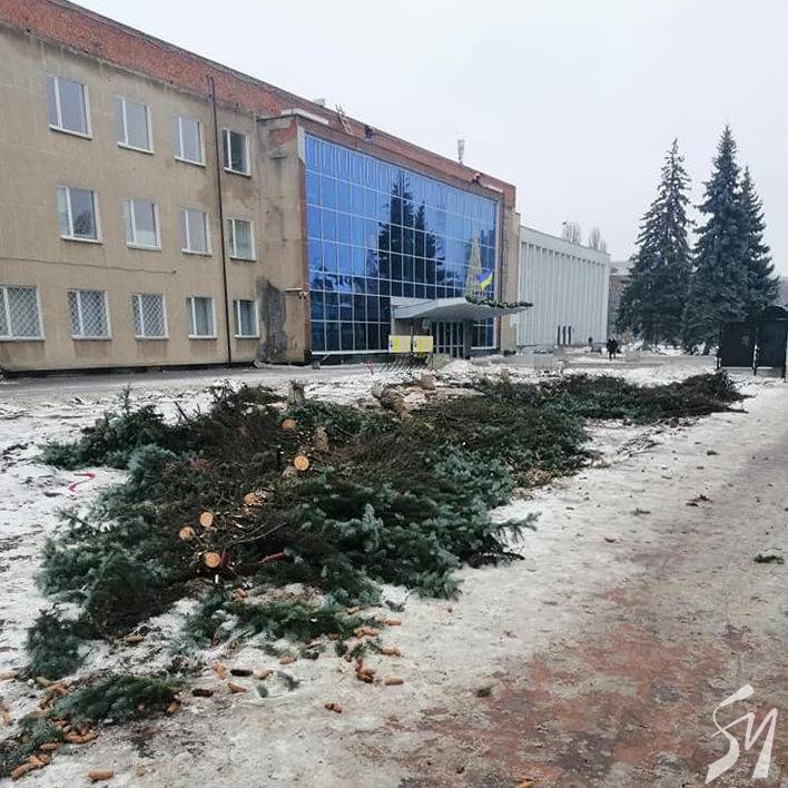 «5 величезних ялин зрубано згідно з проектом реконструкції оцього радянського "шедевру" архітектури. На їхньому місці зроблять велику клумбу з автополивом. Мовляв, ялини були старі і закривають фасад, який видозмінять», – прокоментувала подію Наталія Потапчук.