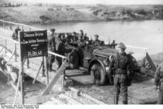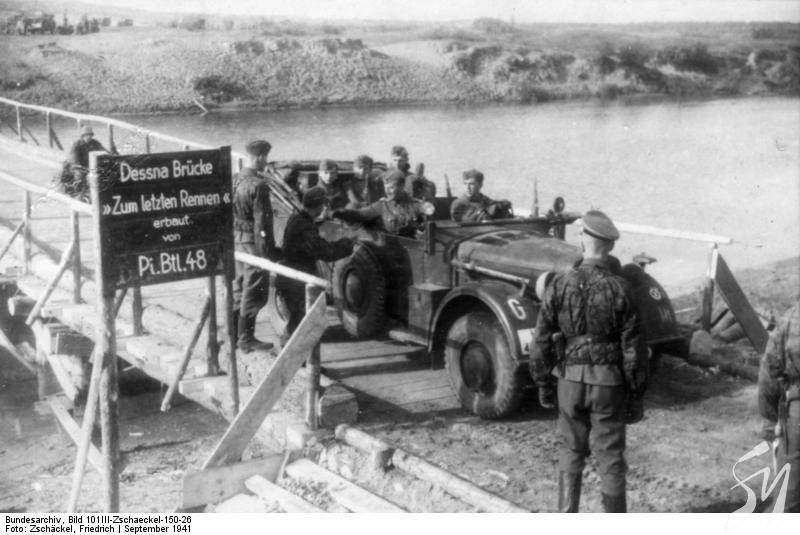 Кабріолет з німцями й розпізнавальним знаком Das Reich на мосту через річку Десна.